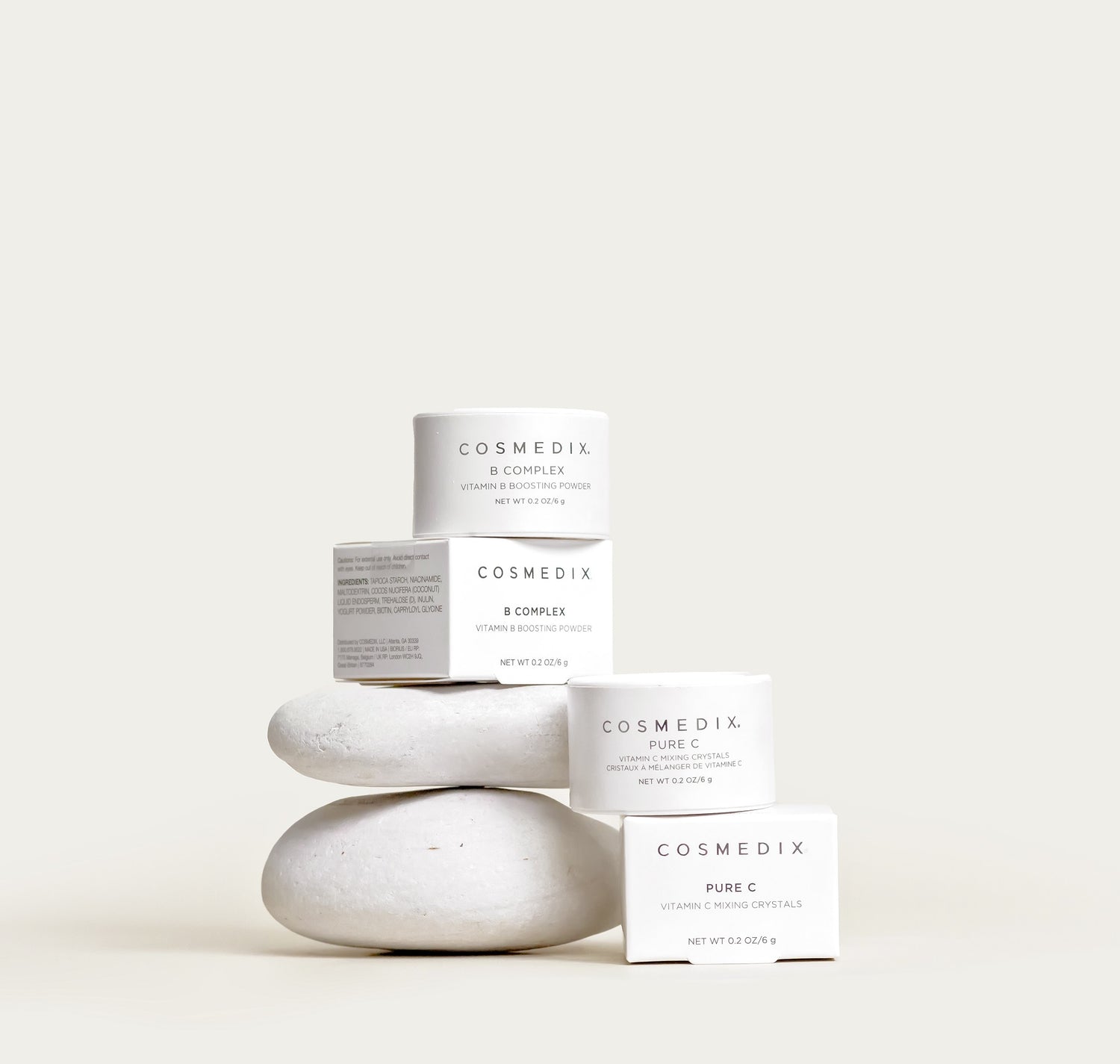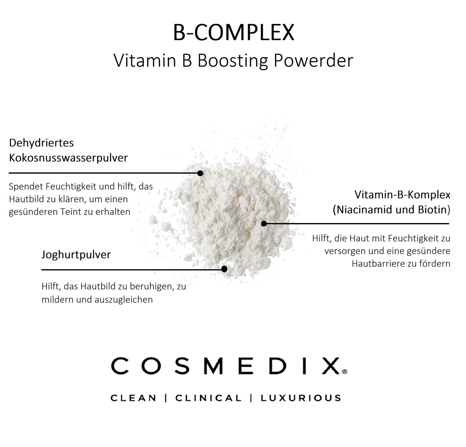 Mische tagsüber eine Prise B Complex Vitamin B Boosting Puder mit Deiner bevorzugten COSMEDIX Feuchtigkeitscreme oder SPF.